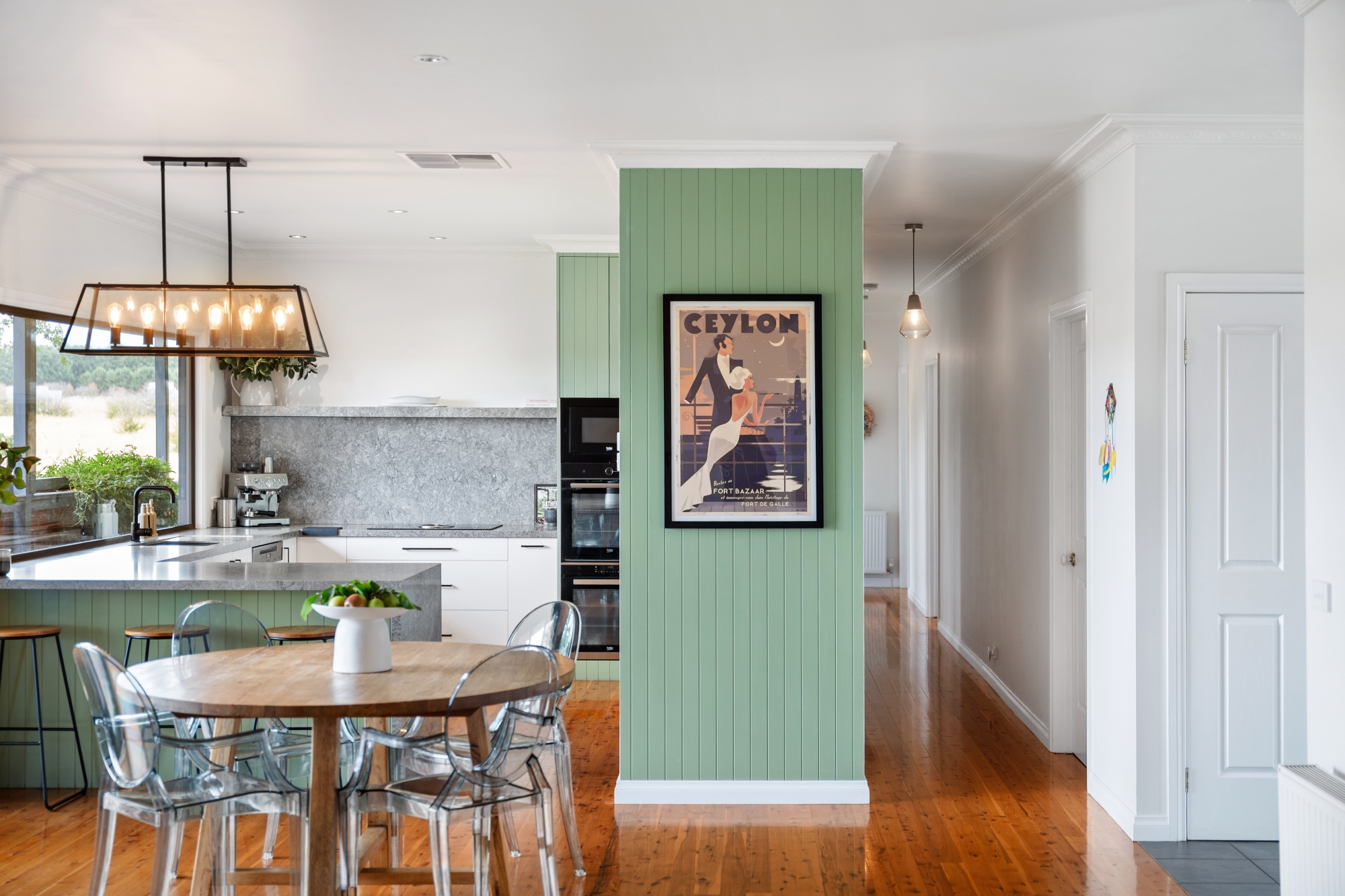 At the heart of the home, the north-facing open-plan kitchen, dining, and living area is bathed in natural light, extending onto an elevated patio that offers breathtaking views of the Campaspe River and sweeping countryside. The perfect setting for alfresco gatherings, it simply calls for a fine bottle of wine and a curated selection of cheeses.